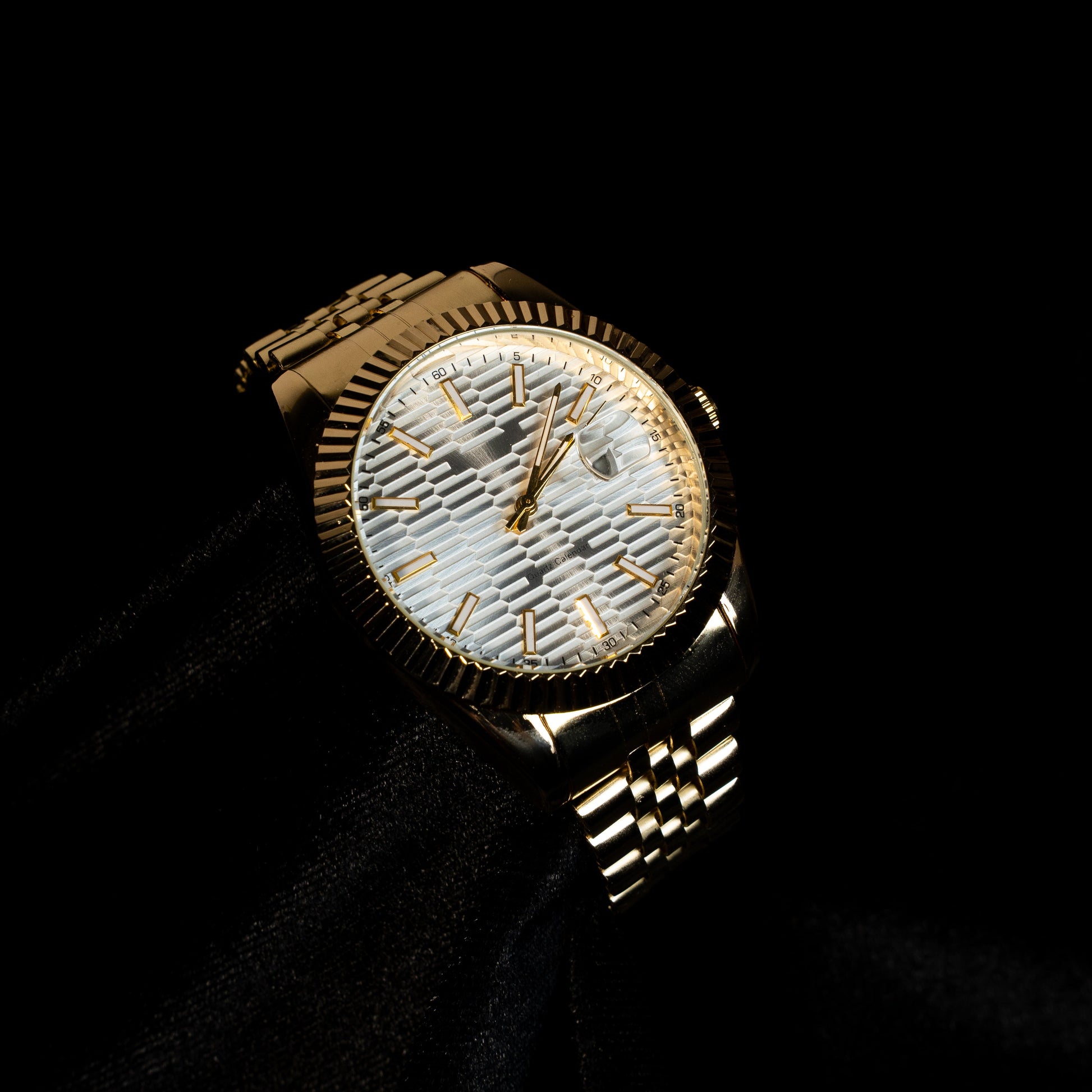 Dokulu açık renk kadranı ve tırtıklı kasa detayıyla güçlü bir duruş sergileyen bu erkek saat modeli, klasik çizgileri modern tasarımla birleştirir. Altın tonlu kasa ve metal kordon, saate net ve prestijli bir görünüm kazandırırken; sade indeksler ve tarih penceresi kullanım kolaylığı sunar. Günlük stilini tamamlamak isteyenler için şık, özel günlerde ise zamansız bir tercih olarak öne çıkar.