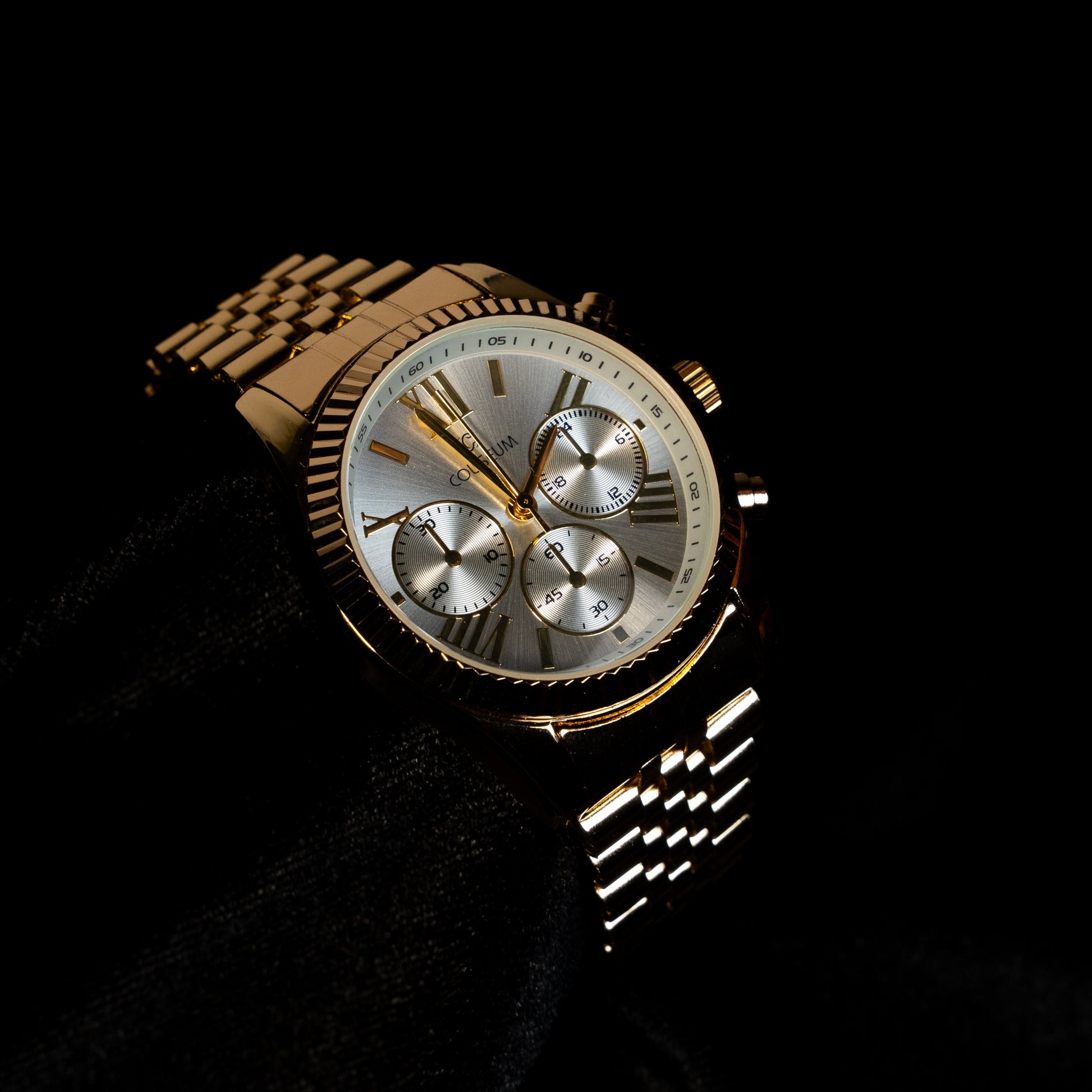Güçlü duruşu ve çok göstergeli kadran tasarımıyla öne çıkan bu erkek saat, klasik şıklığı modern detaylarla birleştirir. Altın tonlu metal kordonu ve tırtıklı kasa yapısı saate maskülen ve prestijli bir karakter kazandırır. Detaylı kadran yapısı, saati sadece zamanı gösteren bir parça olmaktan çıkararak stilin tamamlayıcı bir unsuru haline getirir. Günlük kullanımda olduğu kadar özel kombinlerde de rahatlıkla tercih edilebilecek, zamansız ve iddialı bir modeldir.