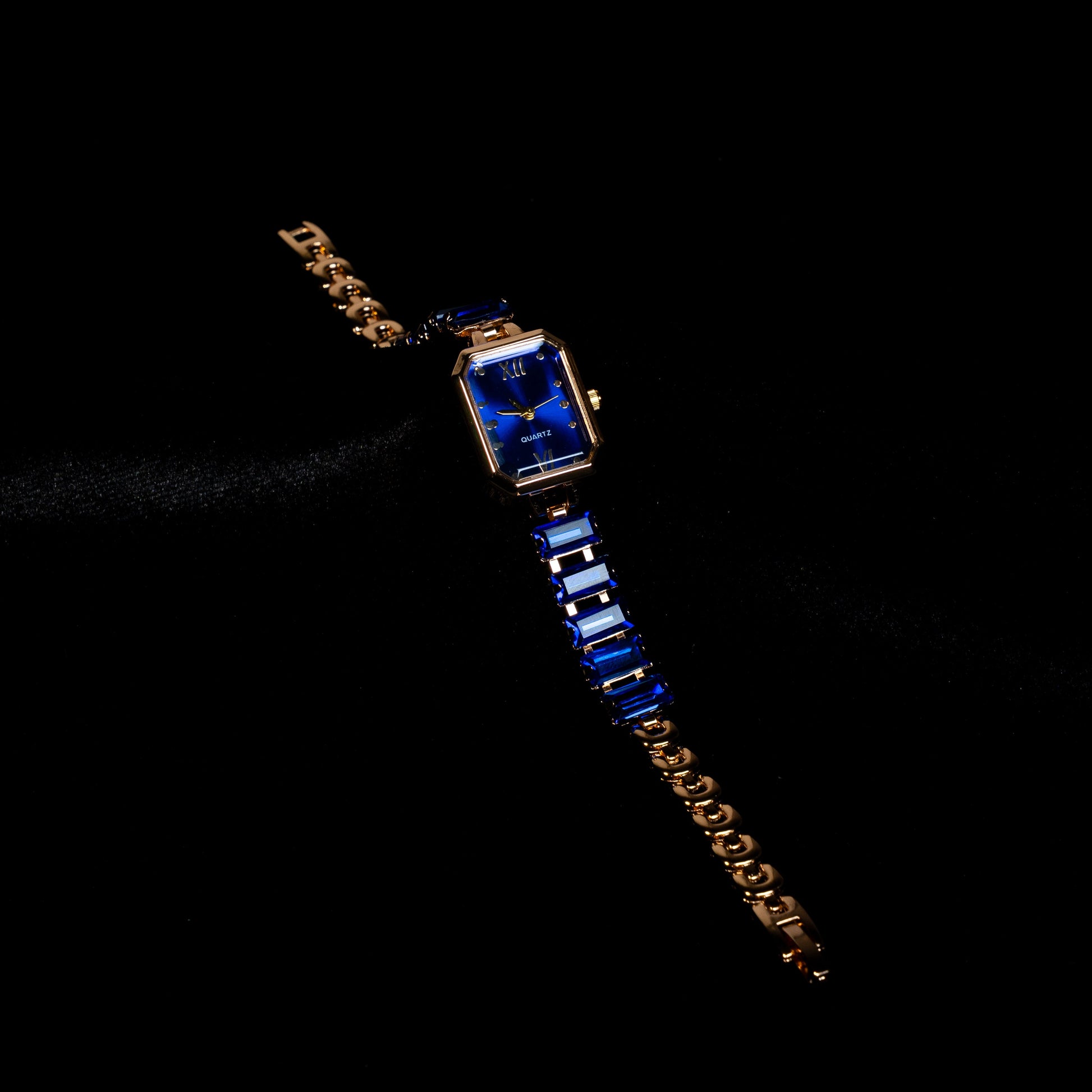 Derin mavi kadranı ve dikdörtgen kasa tasarımıyla dikkat çeken bu kadın saat, güçlü ve zarif bir stil sunar. Taş detaylı bilezik bölümü saate modern bir ışıltı katarken, altın tonlu metal zincirle dengeli bir görünüm oluşturur. Bilekte şık bir aksesuar gibi duran bu model, hem günlük kombinlerde hem de özel davetlerde stilini öne çıkarmak isteyenler için ideal bir tamamlayıcıdır.