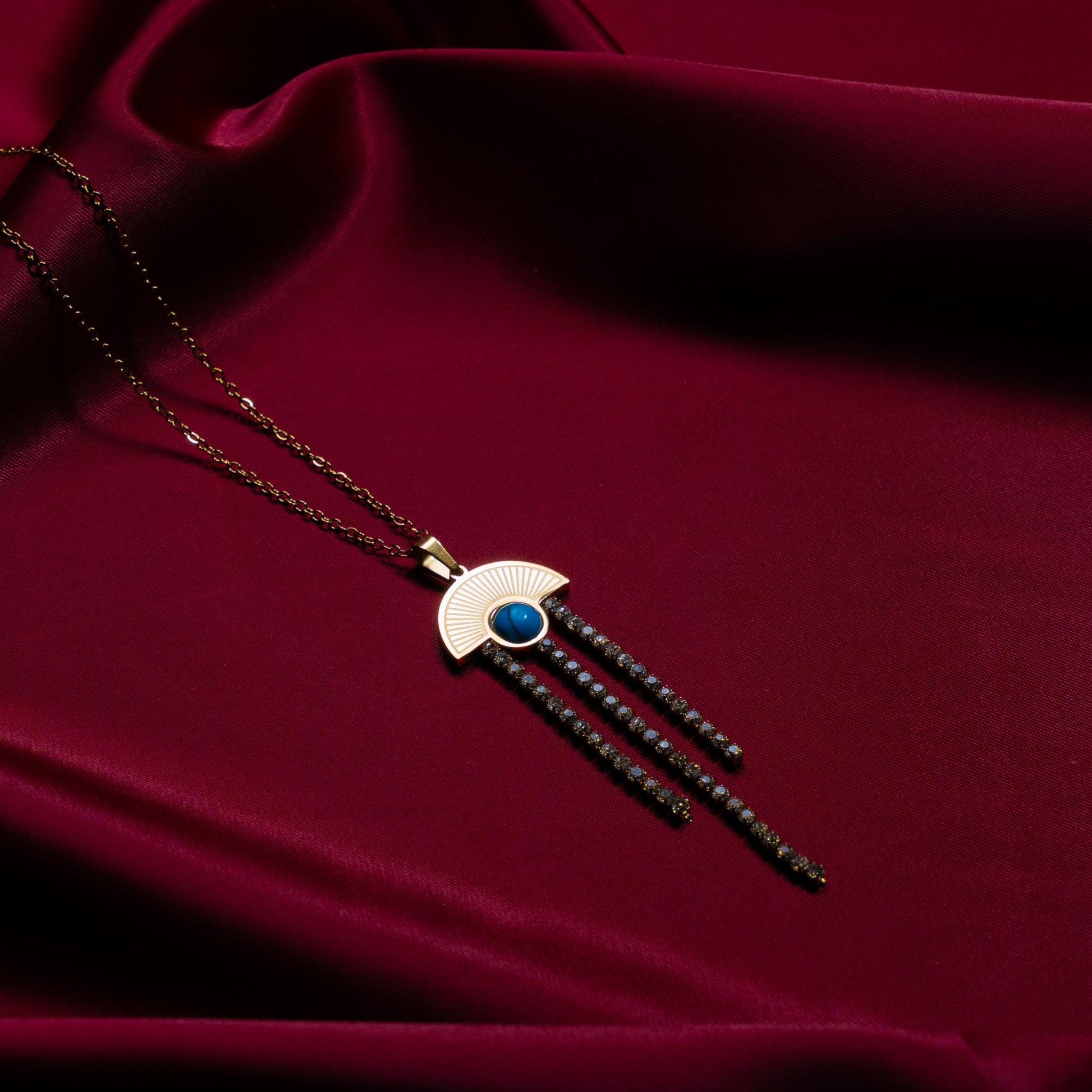 Mavi taş detayı ve zarif püskül formuyla tasarlanan bu çelik kolye, modern ve dikkat çekici bir stil sunar. Kararma yapmayan çelik yapısı sayesinde uzun süreli kullanım sağlar. Günlük kombinlerde sade bir şıklık, özel anlarda ise tamamlayıcı bir detay olarak öne çıkar.