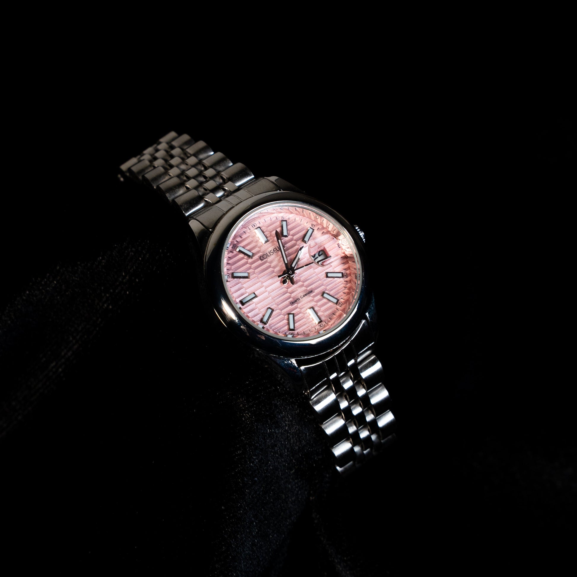 Pembe tonlardaki desenli kadranı ve metal bilezik tasarımıyla modern ve zarif bir stil sunan bu kadın saat, günlük şıklığı ön plana çıkarır. Yuvarlak kasa formu klasik bir duruş sağlarken, dokulu kadran tasarımı saate karakterli bir görünüm kazandırır. Metal bilezik yapısı bilekte dengeli ve konforlu bir kullanım sunar. Sade ama dikkat çekici detaylardan hoşlananlar için şık ve tamamlayıcı bir aksesuardır.
