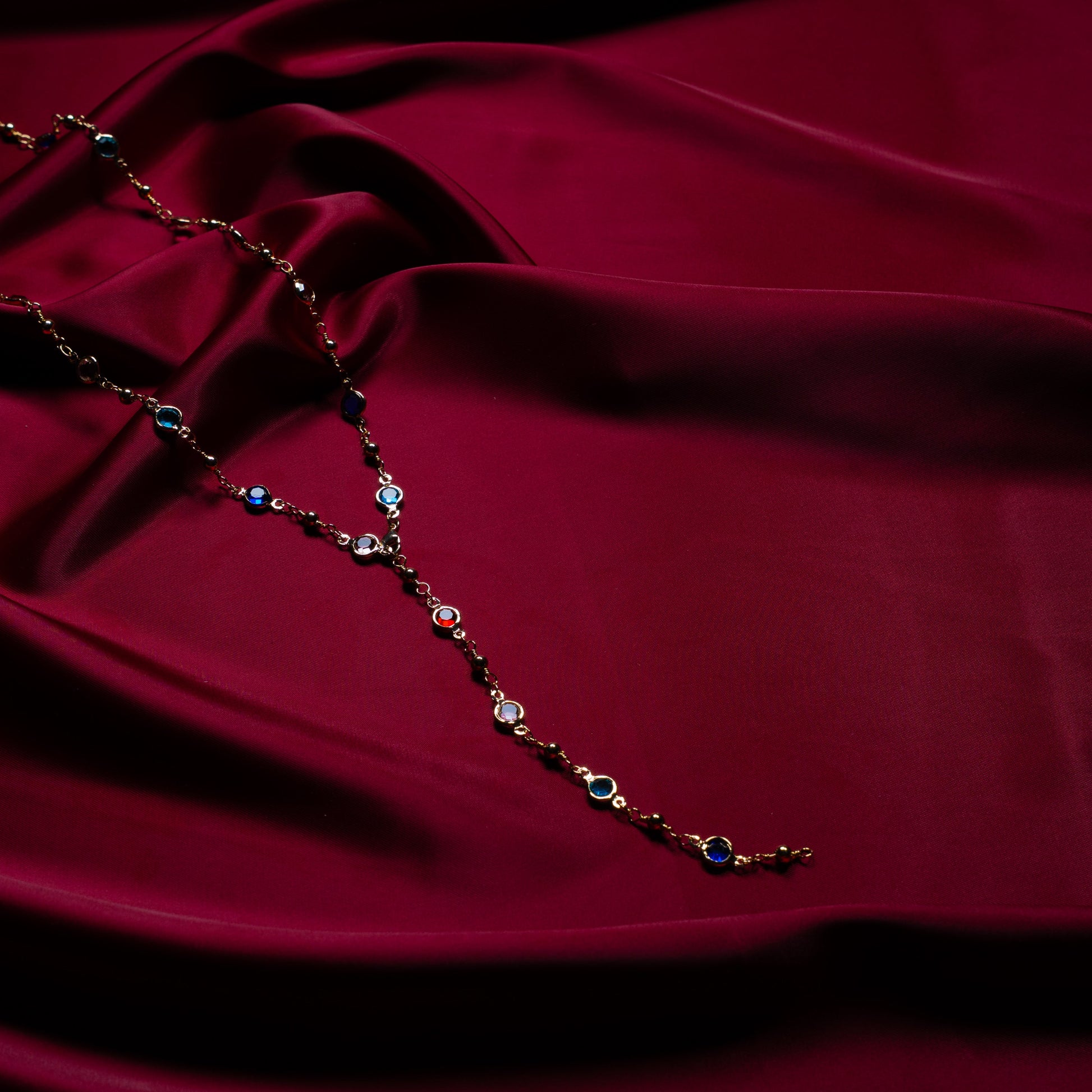 Renkli taş detaylarıyla hareket kazanan bu uzun zincir kolye, zarif ve modern tasarımıyla günlük kullanımdan özel davetlere kadar geniş bir kullanım alanı sunar. İnce zincir yapısı boyunca dengeli şekilde yerleştirilen renkli taşlar, kolyeye sofistike ve dikkat çekici bir görünüm kazandırır.