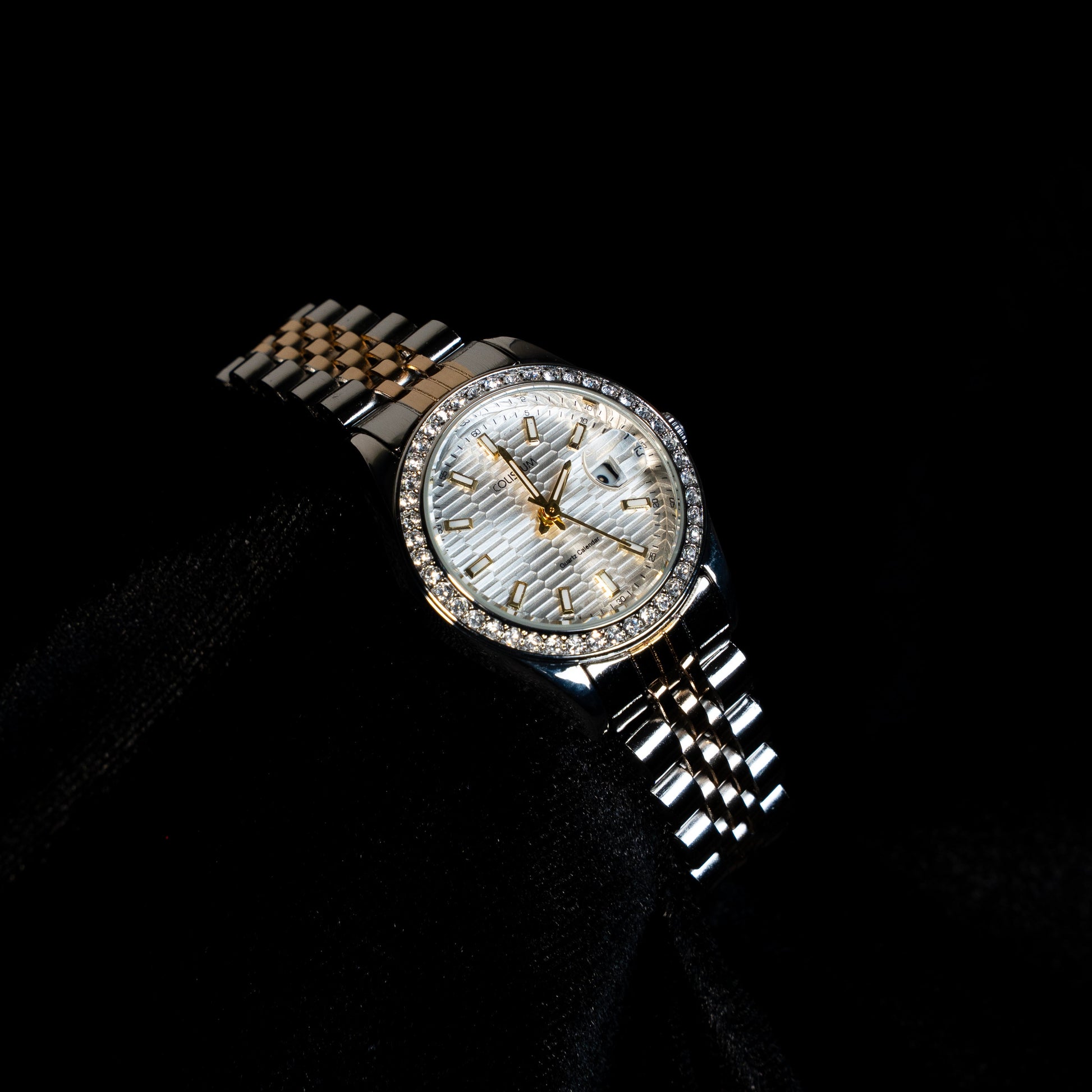 Desenli kadranı ve taşlarla çevrelenmiş yuvarlak kasa tasarımıyla zarif bir şıklık sunan bu kadın saat, klasik detayları modern bir dokunuşla tamamlar. Metal bilezik yapısı bilekte dengeli ve konforlu bir duruş sağlarken, taş çerçeve saate ince bir ışıltı katar. Günlük kombinlerden özel davetlere kadar geniş bir kullanım alanı sunan, zamansız ve şık bir aksesuardır.
