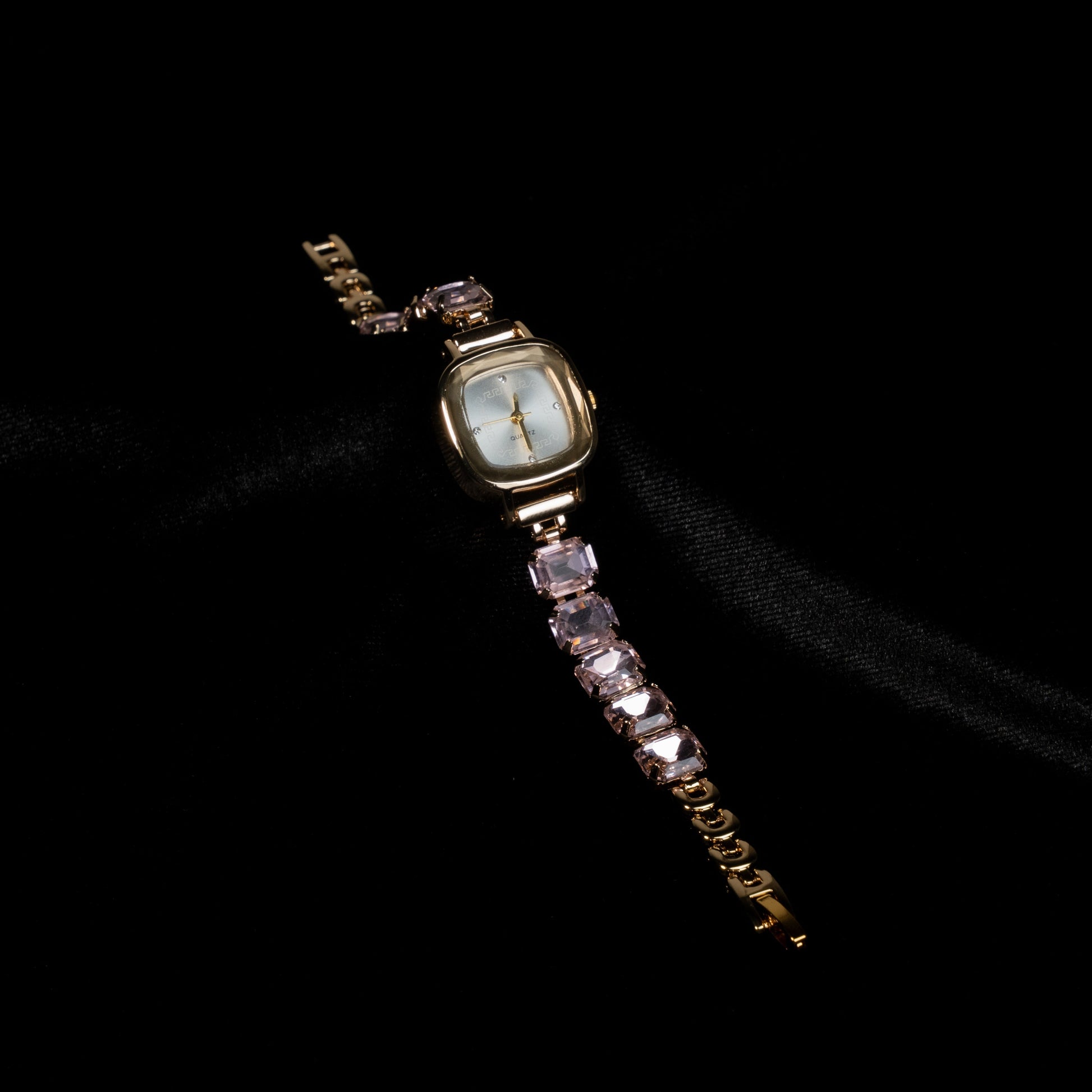 Taş detaylı bilek yapısı, saati yalnızca zamanı gösteren bir parça olmaktan çıkarır. Zarif kasa formu ve ışığı yumuşak şekilde yansıtan detaylarıyla bileğinizde ince ama dikkat çekici bir etki bırakır. Feminen, dengeli ve şık bir stil arayanlar için özel bir tamamlayıcı.