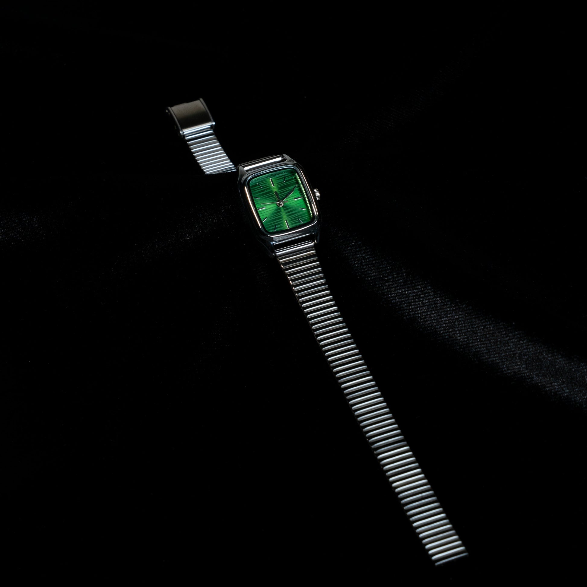 Canlı yeşil kadranı ve dikdörtgen kasa formuyla modern bir karakter sunan bu saat, klasik saat algısına cesur bir yorum getirir. Işığa göre ton değiştiren kadran yüzeyi saate derinlik katarken, ince metal bileziği bilekte akıcı ve konforlu bir duruş sağlar. Günlük kombinlere güçlü bir vurgu eklemek isteyenler için tasarlanan bu model, sade detaylarıyla dikkat çekerken özgün stilini net bir şekilde ortaya koyar.