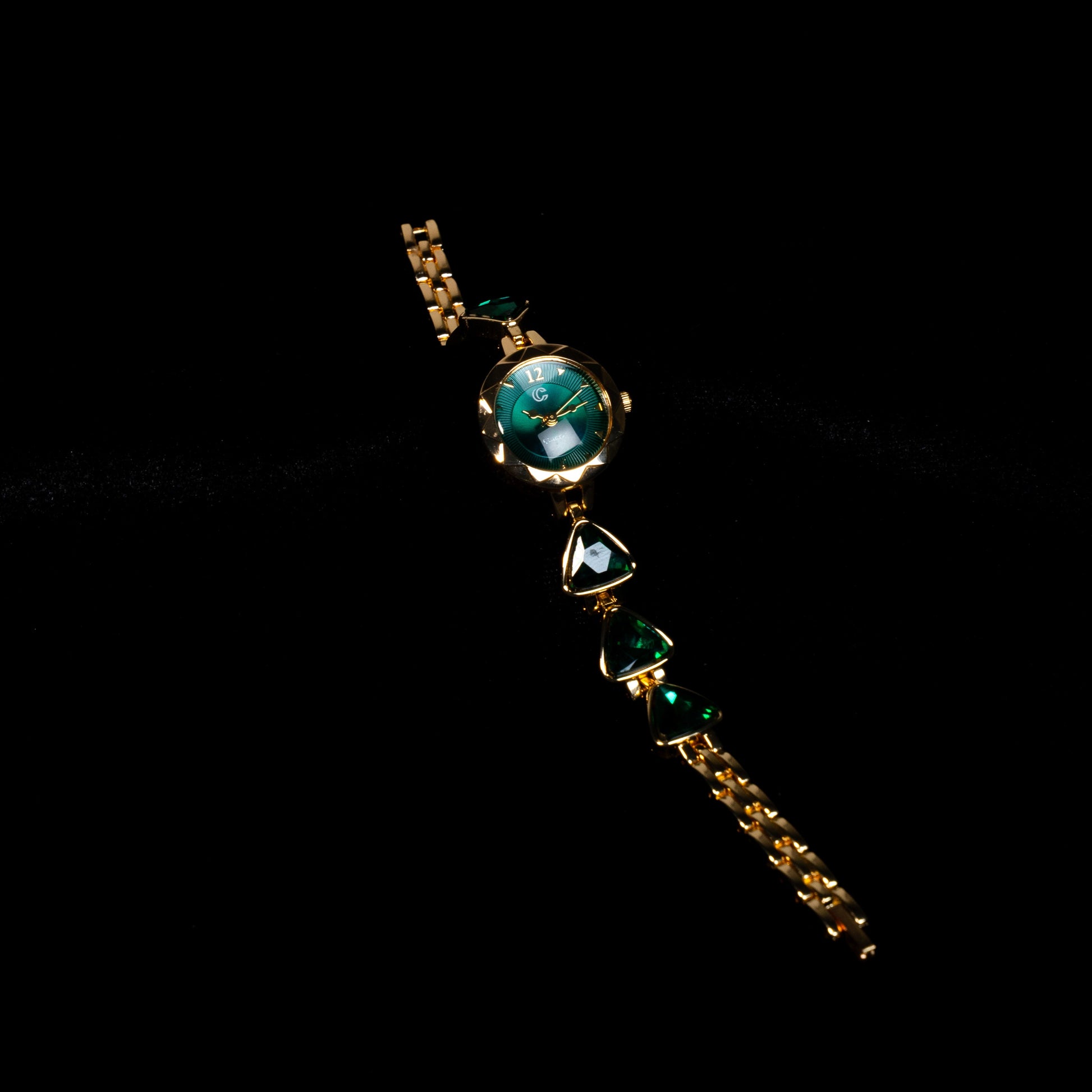Yeşil Kadranlı Üç Taş Detaylı Kadın Saat