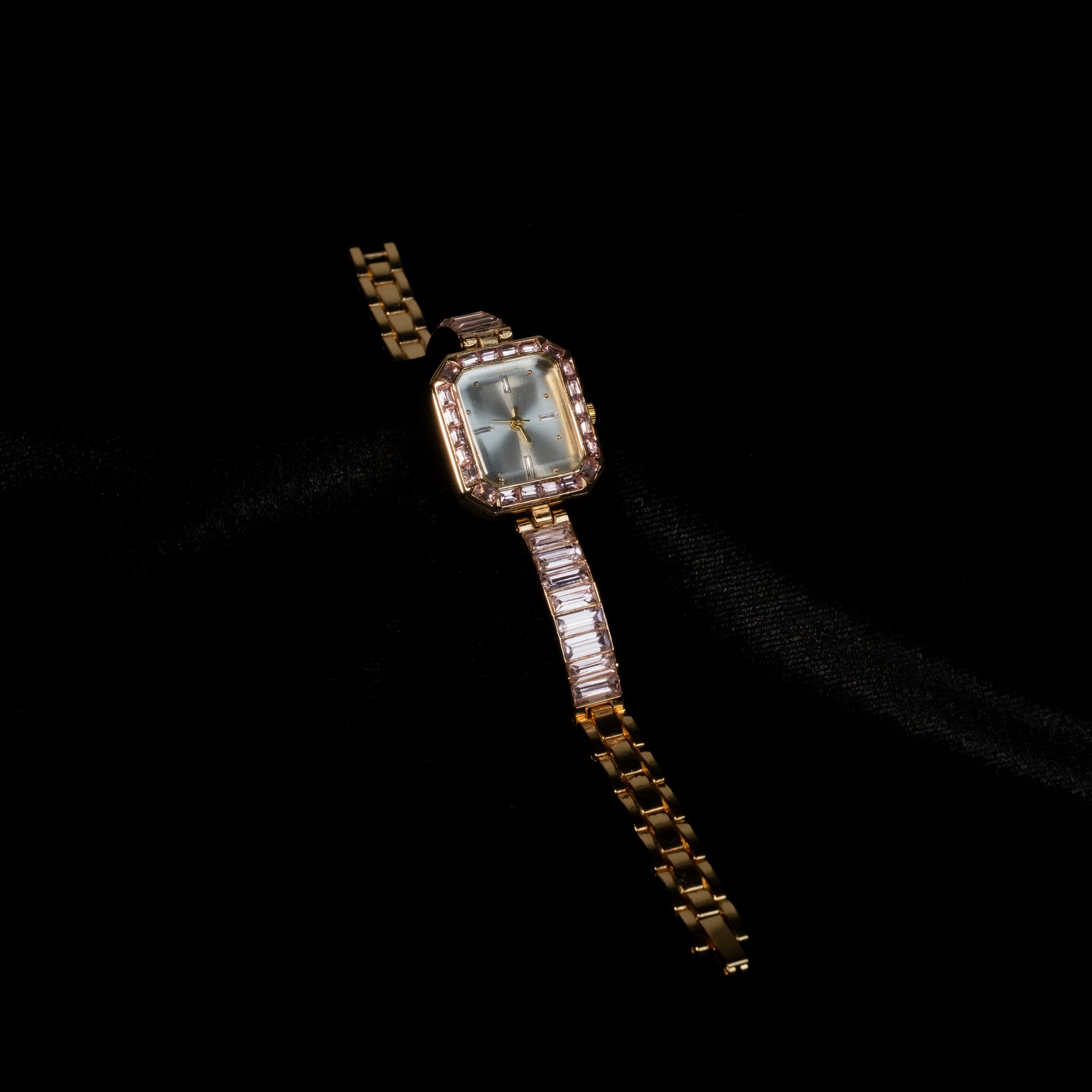 Işığı yakalayan taş çerçevesi ve köşeli kasa formuyla güçlü bir duruş sergiler. İnce detaylarıyla klasik şıklığı modern bir yorumla bileğinizde buluşturur. Günlük kombinlerden özel anlara kadar stilinizi tamamlayan iddialı bir parça.