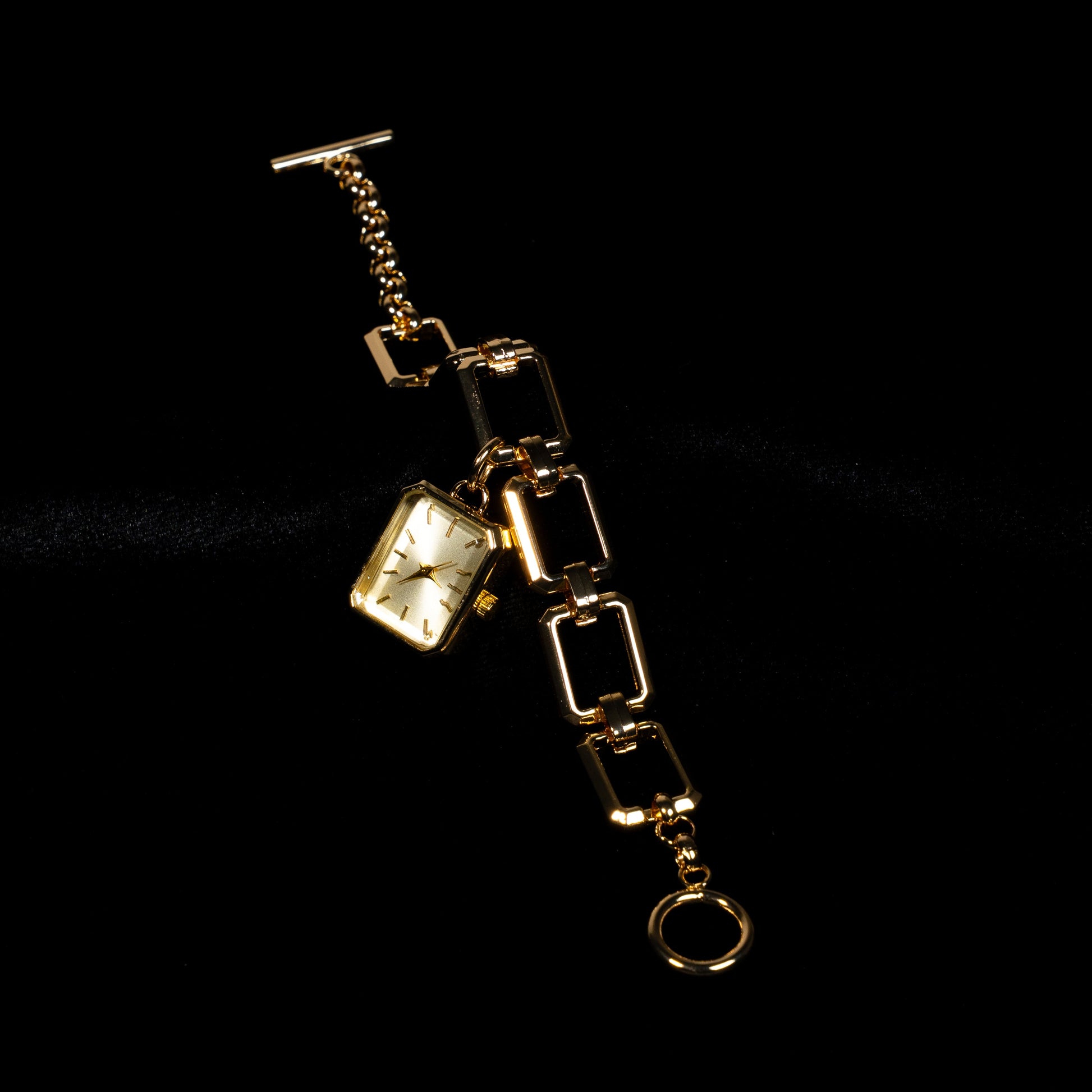 Zincir Detaylı Kare Kasa Altın Tonlu Kadın Saat
